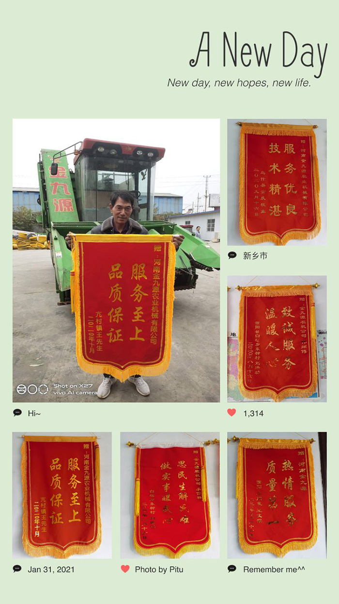 ? ? 2021牛年的腳步越來越近,河南金九源公司不負眾望,凝心聚力,傾情打造2021款穗莖兼收機!伴隨著公司成長的腳步,我們承載著太多的期待。心存感激,永續前行,我們會不斷創新、提升自我、打造精品、塑造品牌,一路與您同發展,共進步,服務無止境,真情到永遠!